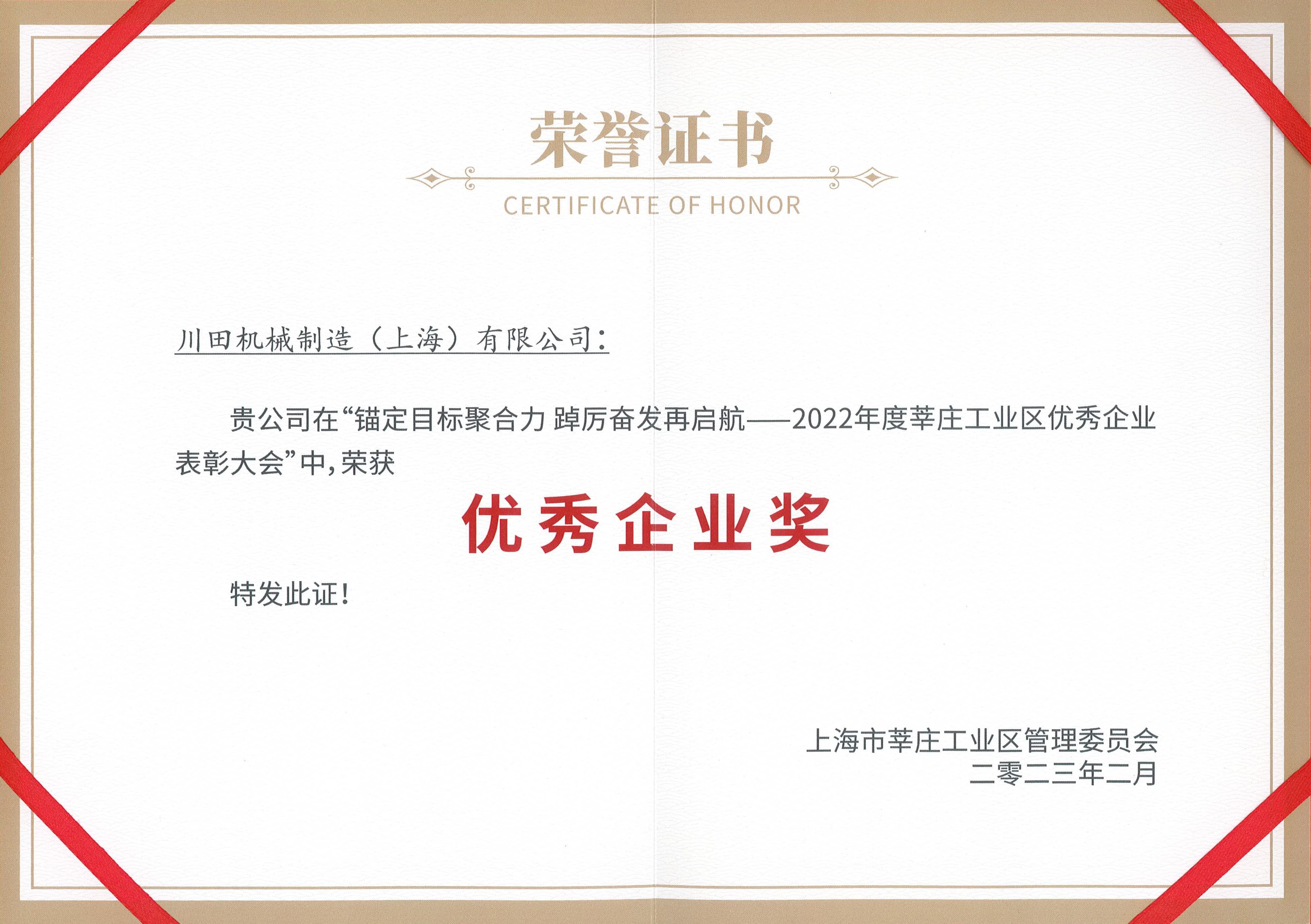 2022 莘莊工業(yè)區(qū) 優(yōu)秀企業(yè)證書(shū)